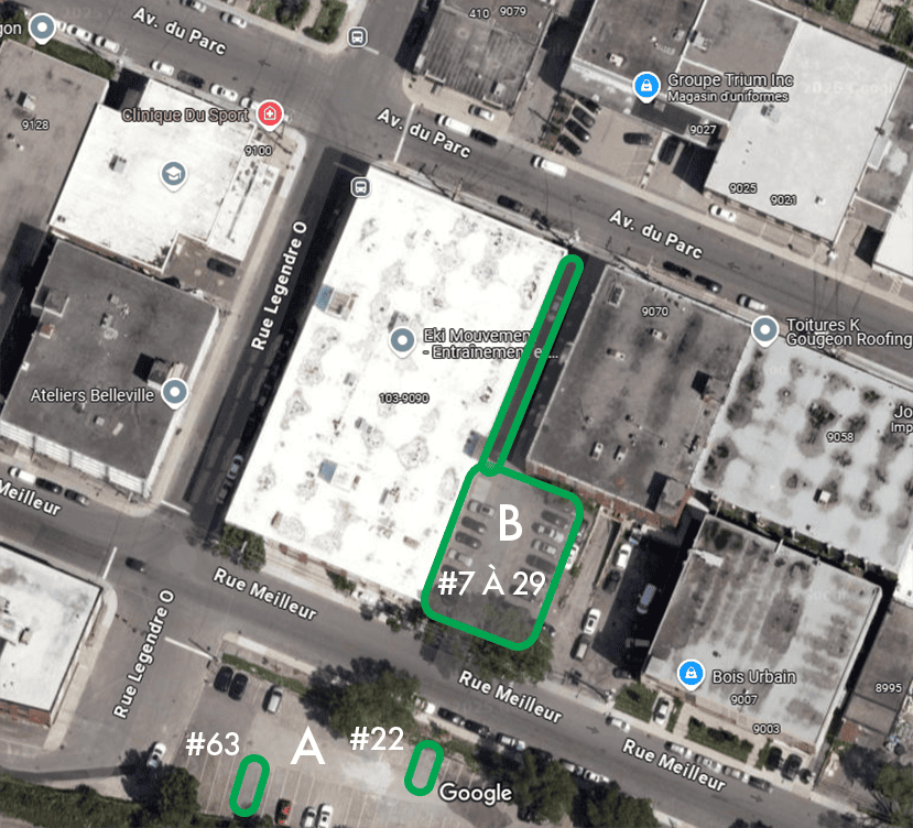 Places #7 à 29, incluant le côté Nord de la ruelle en arrivant de la rue Parc